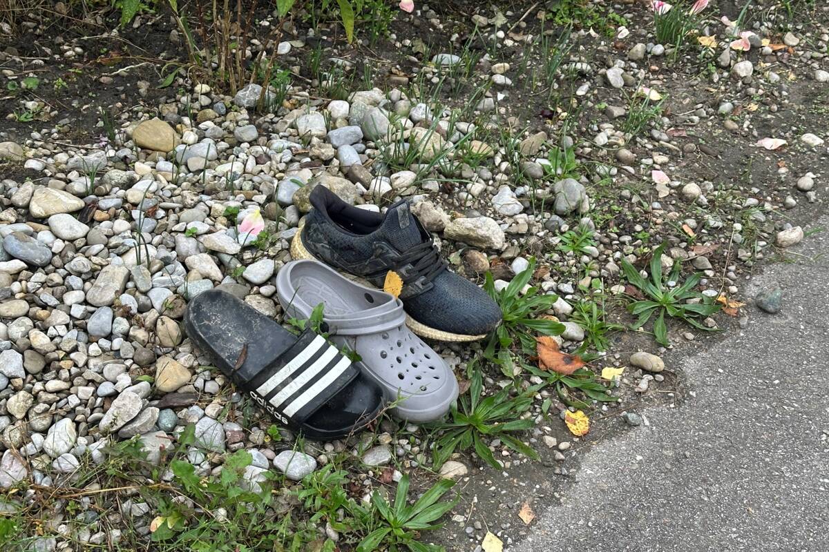 Da stehen vor einem Hause Schuhe aufgereiht. Inzwischen haben einige Besitzer sie auch schon entdeckt und mitgenommen.