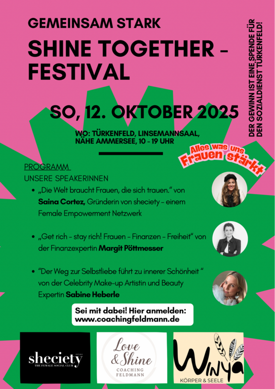 Am Sonntag,12. Oktober 2025 findet zum ersten Mal das SHINE TOGETHER – Festival in Türkenfeld statt– ein Tagesevent von Frauen für Frauen, das Verbindung, Empowerment und echte Stärkung in den Mittelpunkt stellt. Das Motto ist „Gemeinsam stark“ – es geht darum, Frauen wieder in ihre Kraft zu bringen, sie zu inspirieren, zu vernetzen und ihnen Raum zu geben, ihre Ziele, Träume und Talente mutig zu leben. Neben professionellen Coaching-Impulsen von der Psychologin Carina Feldmann gibt es eine Open Stage für inspirierende Geschichten, Austausch auf Augenhöhe und eine liebevoll gestaltete Oase für Körper, Geist und Seele im neuen Winya Yoga-Studio.