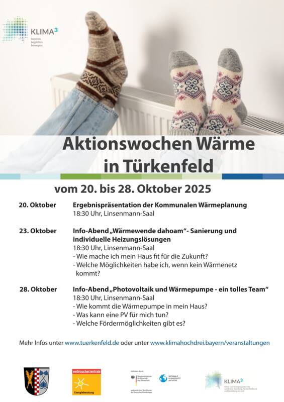 Nachhaltige, klimaneutrale und bezahlbare Heizungen für Häuser und Wohnungen, Betriebe und öffentliche Gebäude sind ein wichtiger Teil der Energiewende. Um hierfür die Möglichkeiten und Potenziale auf lokaler Ebene zu untersuchen, hat Türkenfeld in den vergangenen Monaten die gesetzlich vorgeschriebene Kommunale Wärmeplanung durchgeführt. Um die Bürgerinnen und Bürger sowie das örtliche Gewerbe umfassend über die Ergebnisse zu informieren und in die Diskussion der weiteren Schritte einzubinden, sind im Herbst zwei „Aktionswochen Wärme“ mit folgenden Veranstaltungen geplant, die alle im Linsenmann-Saal stattfinden: